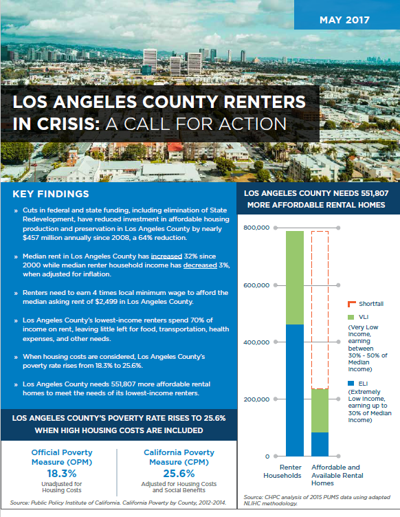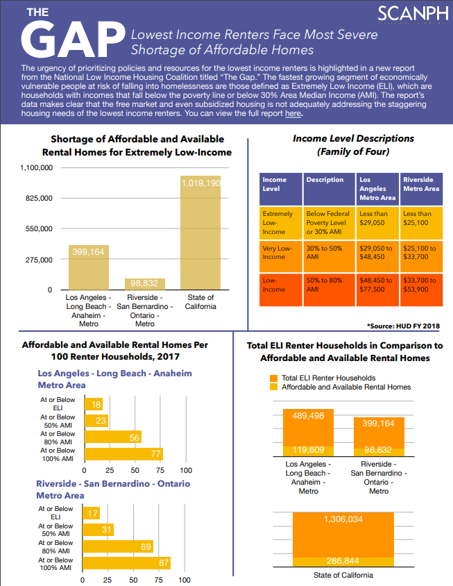 The magnitude of the housing crisis is documented in a new reports that show the shortage of housing that is affordable and available to the lowest-income renters. As housing supply has lagged, rents have risen faster than renters’ incomes over the last two decades. The National Low Income Housing Coalition has published its annual analysis of recent data, titled "The Gap," to highlight the urgency of prioritizing resources for the lowest income renters. The fastest growing segment of economically vulnerable people at risk of falling into homelessness are those defined as Extremely Low Income (ELI), which are households with incomes that fall below the poverty line or below 30% Area Median Income (AMI). SCANPH's snapshot of the data specific to the Southern California region is presented in the report below.
