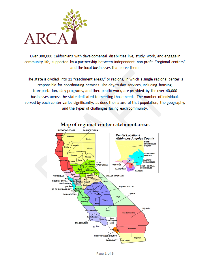 Association of Regional Center Agencies (ARCA) had drafted the attached paper meant to be a brief overview of our service system. This document provides a summary of how the system supports the over 300,000 Californians with developmental disabilities to live, study, work, and engage in community life, supported by a partnership between independent non-profit “regional centers” and the local businesses that serve them.