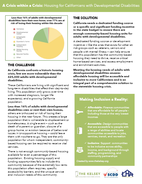 As California confronts a historic housing crisis, few are more vulnerable than the 625,000 adults with developmental disabilities. These Californians are living with significant and long-term disabilities that affect their day-to-day living. This population only grows over time with increased diagnosis, longer life expectancy, and a growing California population. Less than 16% of adults with developmental disabilities own or rent their own homes, others are unhoused or risk of losing their housing in the near future . This creates a large population that is vulnerable to displacement or homelessness.